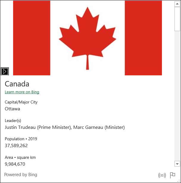 Kun maantieteen tietotyyppi, voit hakea tietoja, kuten väestön, aikavyöhyke, aluejohtajat, bensiinin hinnat, kielen ja paljon muuta. Tiedot ovat peräisin online-lähteestä, voit päivittää tarpeen mukaan. Joten, jos tarvitset tällaista tietoja taulukon uudelleen, kunhan olet yhteydessä Internetiin, voit pudottaa sen!