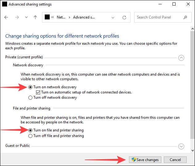 Kun ”Verkko löytö” osiossa ”Yksityinen (nykyinen profiili),” jotta ”Kytke Network Discovery” ja vieressä oleva ruutu ”Ota automaattiset määrittää verkkoon kytkettyjä laitteita.” Myös mahdollistaa ”Ota tiedostojen ja tulostimien jakaminen” vaihtoehto. Sitten klikkaa ”Tallenna muutokset” -painiketta.