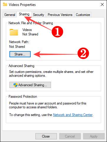 In ”Properties” -ikkunan ”Sharing” -välilehti ja valitse ”Jaa” -painiketta.