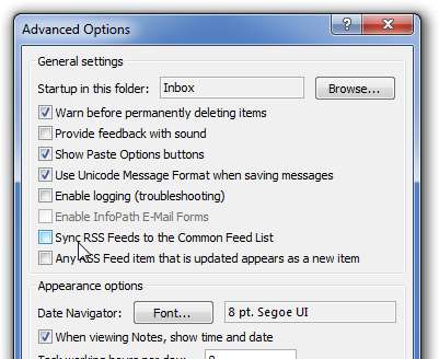 Oletko koskaan huomannut, että Microsoft Outlook käyttää IE7: n tai IE8: n yleisen syöteluettelon syötteitä? Jos et todellakaan käytä Outlookia RSS-lukijana, ei ole mitään syytä ottaa tämä ominaisuus käyttöön ja tuhlata tilaa postilaatikossa.