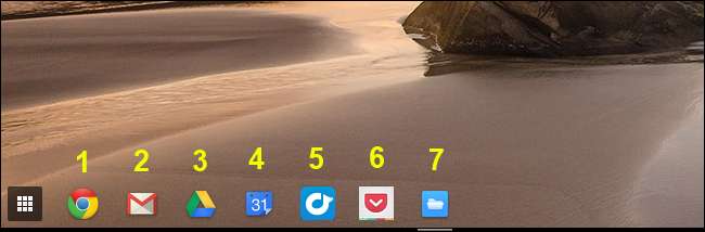 Alt + 1-8 - Käynnistä sovellukset, jotka sijaitsevat Chrome-käyttöjärjestelmän hyllyllä tai tehtäväpalkissa. Esimerkiksi Alt + 1 käynnistää ensimmäisen sovelluksen pikakuvakkeen vasemmalta.