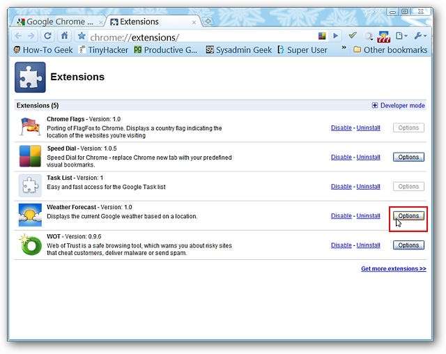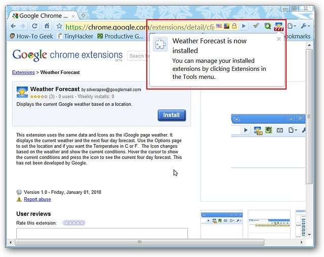 Kun laajennus on asennettu, näet uuden "Sääennuste-työkalupalkin painikkeen" ja lyhyen laajennuksen hallintaviestin. Huomaa, että tällä hetkellä "Työkalupalkin painike" näyttää vain "kysymysmerkit" ... tämä johtuu siitä, että vaihtoehdoissa ei ole vielä määritetty sijaintia.