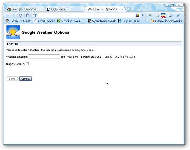 Vaihtoehdoista on erittäin helppo huolehtia ... sinun tarvitsee vain syöttää sijaintisi (nimi tai postinumero) ja päättää, haluatko lämpötilan näkyvän Celsius-asteina vai ei.
