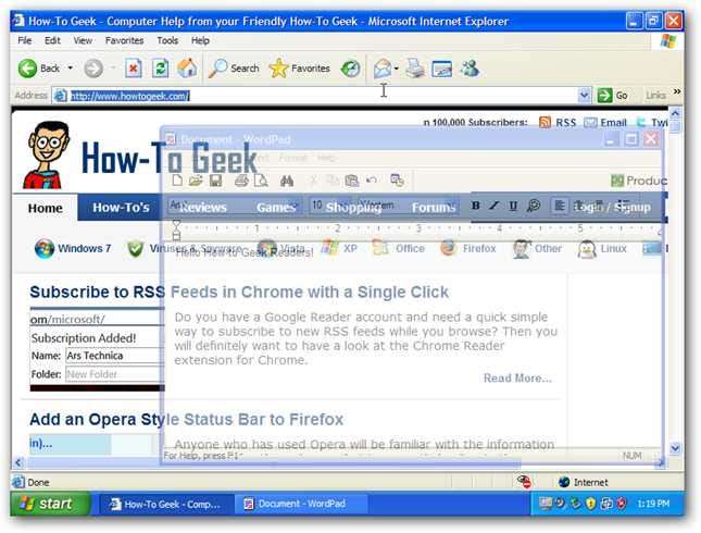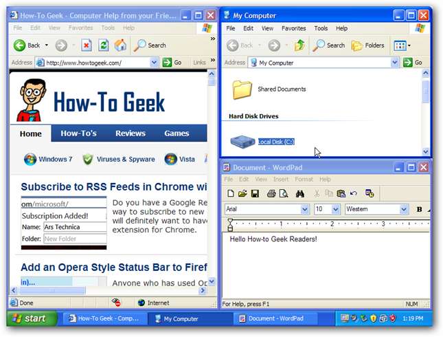 Tässä on 3 ikkunaa, jotka on napsautettu XP: n sivuille. Voit sekoittaa snap-tiloja, ja sinulla on esimerkiksi kaksi ikkunaa oikealla puolella ja yksi ikkuna vasemmalla. Tämä on loistava tapa maksimoida tuottavuus, jos tarvitset enemmän tilaa yhdessä ikkunassa.