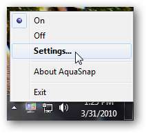 AquaSnapilla on yksityiskohtainen asetusvalintaikkuna, jossa voit säätää sitä toimimaan juuri haluamallasi tavalla. Napsauta hiiren kakkospainikkeella sen kuvaketta tehtäväpalkissa ja valitse Asetukset.