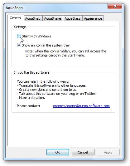 Ensimmäisestä näytöstä voit valita, haluatko AquaSnapin käynnistyvän Windowsilla ja haluatko sen osoittavan kuvaketta ilmaisinalueella. Jos sammutat ilmaisinalueen kuvakkeen, pääset AquaSnap-asetuksiin valitsemalla Käynnistä> Kaikki ohjelmat> AquaSnap> Kokoonpano (tai yksinkertaisesti etsimällä kokoonpanoa Vistassa tai Windows 7: ssä).