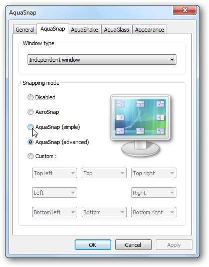 Asetusten toisen välilehden avulla voit valita, mitä kukin napsautusalue tekee. Voit myös valita kaksi muuta esiasetusta, mukaan lukien AeroSnap (joka toimii aivan kuten Windows 7: n oletusarvoinen Aero Snap) ja AquaSnap simple (joka napsahtaa vain näytön reunoihin, ei kulmiin).