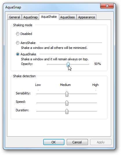 Kolmannen välilehden avulla voit lisätä tai vähentää kiinnitettyjen ikkunoiden peittävyyttä käytettäessä AquaShake-ohjelmaa, ja voit myös lisätä tai vähentää tärinän herkkyyttä. Lisäksi, jos haluat tavallisen AeroShake-toiminnon, joka minimoi kaikki muut avoimet ikkunat, kun ravistat ikkunaa, voit valita myös sen.