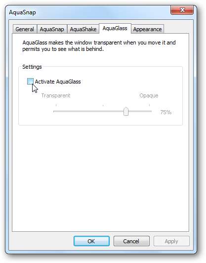 Neljännen välilehden avulla voit aktivoida valinnaisen ominaisuuden, AquaGlassin. Jos aktivoit tämän, ikkunat muuttuvat läpinäkyviksi, kun vedät niitä ruudun yli.