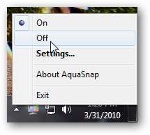 Tai jos haluat poistaa AquaSnapin väliaikaisesti käytöstä, napsauta hiiren kakkospainikkeella sen kuvaketta ja valitse Pois. Windows 7: ssä AquaSnap-toiminnon poistaminen käytöstä palauttaa Windowsin Aero Snap -toiminnon normaalitoiminnot, ja muussa Windows-versiossa se ei enää anna sinun napsauttaa ikkunoita. Voit sitten toistaa vaiheet ja valita Käytössä, kun haluat käyttää AquaSnapia uudelleen.