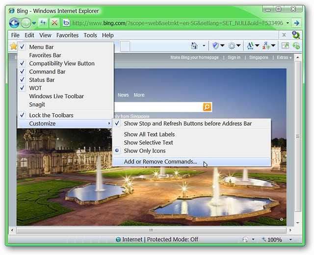 Napsauta hiiren kakkospainikkeella jotakin selaimesi työkalurivistä, siirry kohtaan Mukauta ja valitse Lisää tai poista komentoja ...
