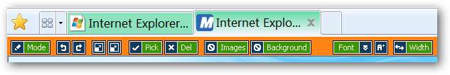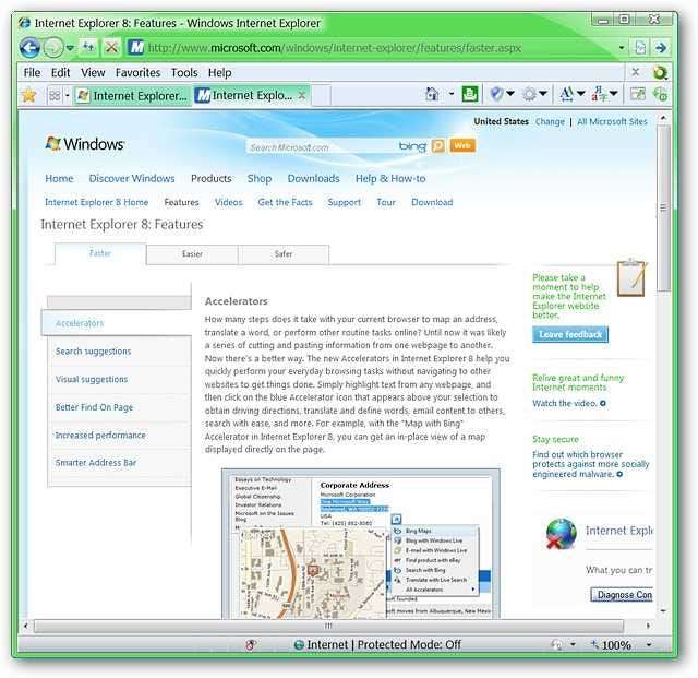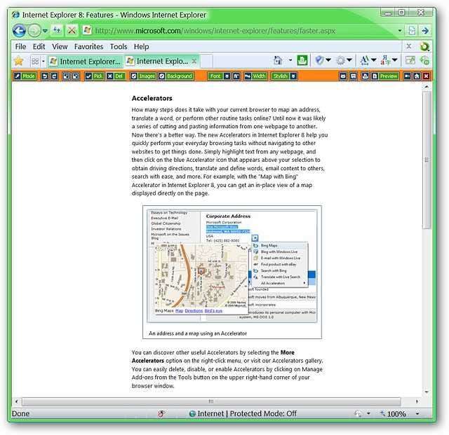 Esimerkkinä päätimme käydä Internet Explorer 8: n Kiihdyttimet-sivulla. Täällä voit nähdä verkkosivun ennen Printee-ohjelman käyttöä ... Huomaa kaikki ylimääräinen sisältö tekstialueen molemmilla puolilla ja yläosassa. Aktivoi Printee napsauttamalla Printee-työkalurivin painiketta.