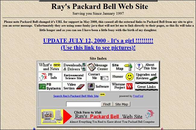 - Rayn Packard Bell -sivusto : Joskus 90-luvun puolivälistä loppupuolelle, kaveri Ray perusti epävirallisen tukisivuston Packard Bell -tietokoneille, joka oli tuolloin suosittu PC-tuotemerkki. Se sisältää yksityiskohtaista tietoa Packard Bell -tietokoneiden eri malleista. Vuoden 2000 puoliväliin mennessä Ray päivitti sitä harvoin, mutta hän tiputti viestin vastasyntyneestä tyttärestään sivun yläosaan.