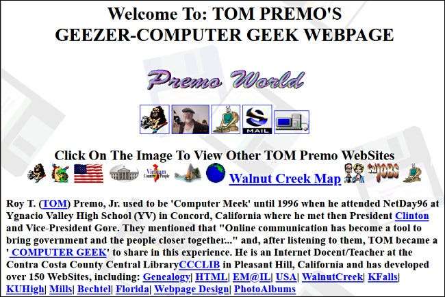 - Tom Premon Geezer-Computer Geek -sivusto : Tämän innostuneen sivuston takana on, että Roy T. (Tom) Premo, Jr., oli lempeä tietokonefani, kunnes tapasi presidentti Bill Clintonin ja varapresidentti Al Goren. Sitten hänestä tuli maagisesti tietokonepeli ja loi loistavasti 90-luvun sivuston, joka oli täynnä pyöriviä animaatioita.
