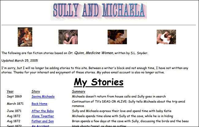 - Tohtori Quinn, lääketieteellinen nainen Fanikirjallisuus : S.L. Snyderin 90-luvun televisio-ohjelman fani-sivusto sisältää kymmeniä rintakiviä kertovia romanssitarinoita sekä joitain tarinoita elämästä, joissa on mukana näyttelijän hahmoja. Se sai viimeisimmän päivityksen vuonna 2005, mutta tarinoiden lukumäärän vuoksi sen on täytynyt olla töissä jo kauan.