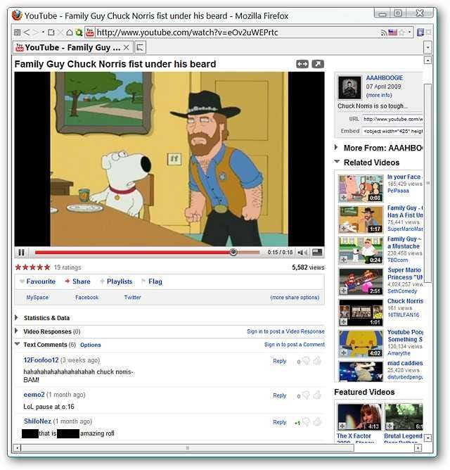 Tässä on sama YouTube-sivu aikaisemmasta… katso kuinka siisti kommenttiosio on. Vain yksi kuudesta kommentista pääsi laajennuksen ohi.
