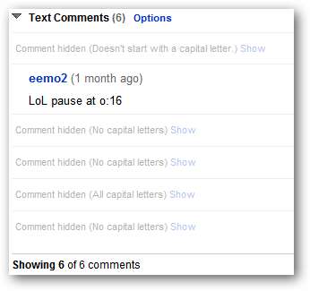 Tässä on lähikuva kommenttiosasta. Huomaa, että jokaiselle piilotetulle kommentille on annettu erityinen syy ja että on mahdollista näyttää yksittäiset kommentit haluttaessa.