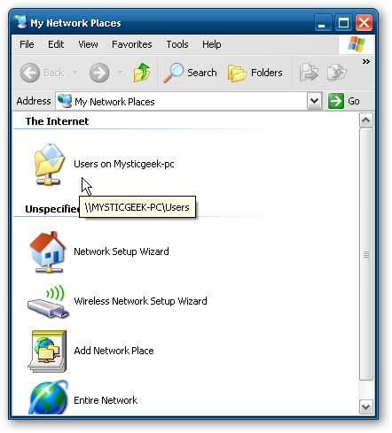 XP-koneesi yli avaamalla Omat verkkopaikat löytääksesi Windows 7: n (mysticgeek-pc) jaettu kansio.