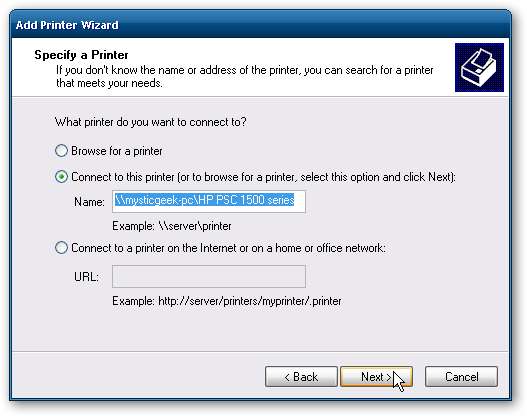 Seuraava valinta "Yhdistä tähän tulostimeen ..." ja kirjoita Windows 7 -laitteeseen liitetyn tulostimen polku ja napsauta seuraavaksi.
