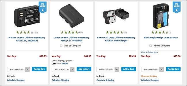 Kolmannen osapuolen akut ovat melkein aina halvempia kuin alkuperäiset. Canonin LP-E6N -akku maksaa 64 dollaria kun taas Blackmagicin - oletettavasti korkealaatuinen - kopio maksaa 35 dollaria. Se on melko jyrkkä ero. Olen nähnyt vähemmän arvostettujen valmistajien paristojen maksavan vain 10 dollaria - enkä aio linkittää niihin.