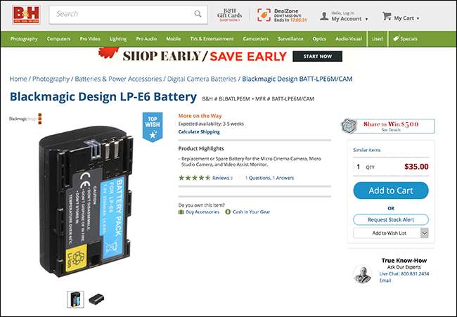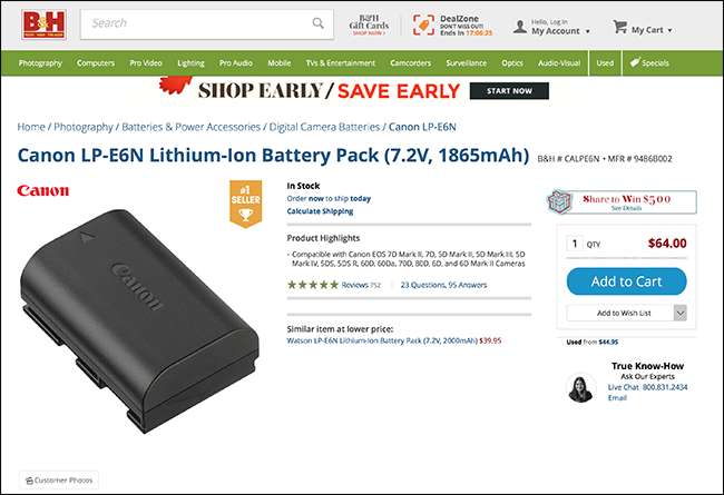 Sen sijaan sinun tulisi ostaa paristoja paikallisesta kamerakaupasta tai korkealaatuinen, omistettu verkkokauppa, kuten B&H . Vaikka päätätkin käyttää kolmannen osapuolen akkua, tiedät ainakin, että sen on tilannut joku, joka tuntee kameroita. Hyvä kamerakauppa myy paljon vähemmän ongelmatuotteita kuin Amazonin avoin, kuka tahansa voi myydä, markkinapaikka.