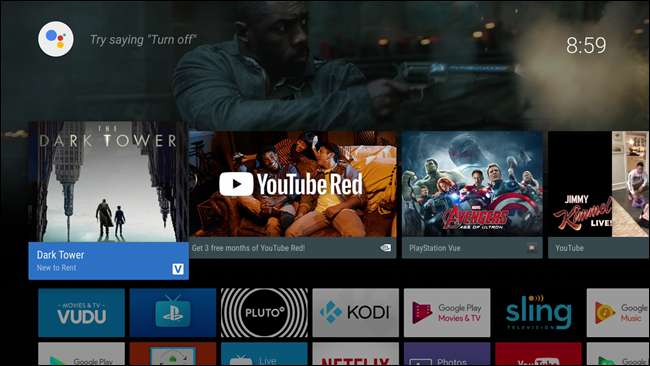 Android TV: n aloitusnäyttö, jossa on paljon suosituksia.