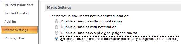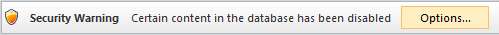 Löysin ensimmäisen asian, jonka haluat poistaa käytöstä Access 2007: ssä. Se on oletusarvoisesti käytössä olevien VBA-makrojen ärsyttävä suojaus.
