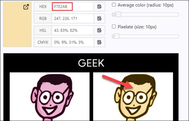 Kun kuva on ladattu, klikkaa tai koskettamalla mitä tahansa valita värin kuvasta. Väri näytetään yläosassa yhdessä hex koodi ”HEX” laatikko.