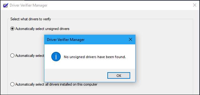 Kun suoritat Driver Verifier -sovelluksen, voit pyytää sitä testaamaan vain allekirjoittamattomat ohjaimet. Kuljettajan vahvistin ilmoittaa sinulle, että järjestelmässäsi ei ole allekirjoittamattomia ohjaimia, jos teet niin.