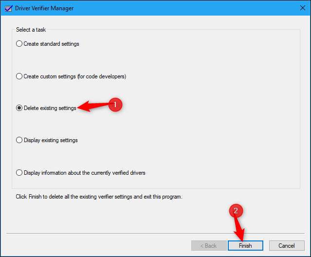 Jos haluat poistaa Driver Verifier -toiminnon käytöstä ja palata normaaliasetuksiin, avaa Driver Verifier -sovellus uudelleen, valitse Poista nykyiset asetukset, napsauta "Finish" ja käynnistä tietokone uudelleen.