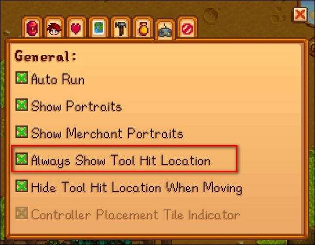 Pour vous aider à bien placer votre outil là où vous le souhaitez, appuyez sur la touche ÉCHAP pour ouvrir le menu du jeu, puis sélectionnez l'onglet avec la petite icône du contrôleur, comme indiqué ci-dessous. Cochez l'option «Toujours afficher l'emplacement de frappe de l'outil».