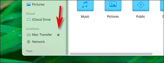 Il est également facile d'éjecter un disque amovible à partir de la barre latérale du Finder. Ouvrez simplement n'importe quelle fenêtre de recherche et développez la section «Emplacements» dans la barre latérale. Cliquez ensuite sur la petite icône d'éjection à côté du nom du lecteur dans la liste.
