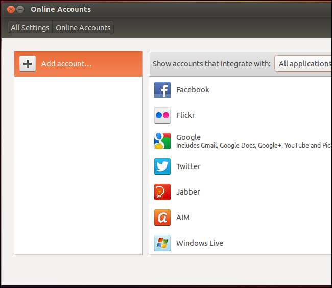 Le panneau de configuration Comptes en ligne vous permet d'ajouter une variété de comptes en ligne à Ubuntu en un seul endroit. Les applications sur votre bureau Ubuntu peuvent s'intégrer à ces comptes. Par exemple, si vous ajoutez un compte Flickr ici, vous pourrez rechercher des photos dans votre compte Flickr et les prévisualiser à partir du tableau de bord d'Ubuntu. Ajoutez un compte Twitter et il apparaîtra dans Gwibber, ou ajoutez un compte AIM et il apparaîtra dans la messagerie instantanée Empathy.