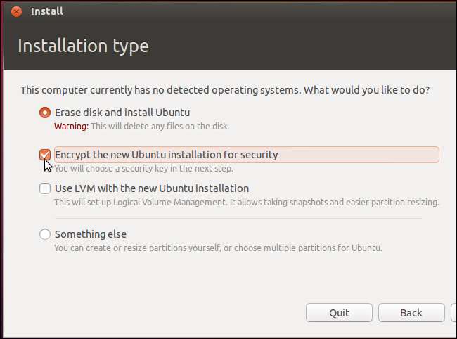 Ubuntu 12.10 offre une configuration facile du chiffrement complet du disque. Activez simplement le Crypter la nouvelle installation d'Ubuntu pour la sécurité option lors de l'installation d'Ubuntu. Auparavant, cela nécessitait l'utilisation d'un autre disque d'installation.
