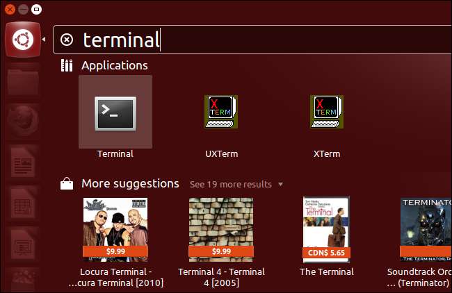Les résultats de la recherche Amazon apparaissent dans le tableau de bord lorsque vous effectuez une recherche. Ainsi, si vous recherchez Terminal pour lancer l'application de terminal, vous verrez des résultats vous permettant d'acheter le film "The Terminal" sur Amazon.com.
