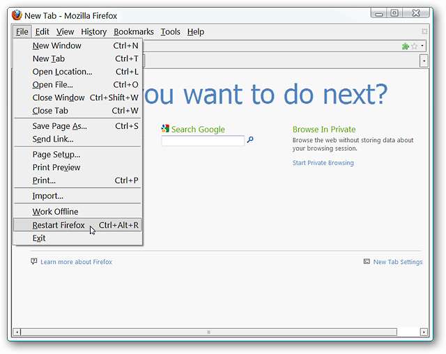 L'installation de l'extension QuickRestart est simple et ne nécessite aucune option. Alors, qu'est-ce que vous obtenez avec l'extension? Trois moyens simples et rapides de redémarrer Firefox. Les deux premiers sont affichés dans le «Menu Fichier»… une commande de menu que vous pouvez sélectionner et la commande clavier appropriée «Ctrl + Alt + R».
