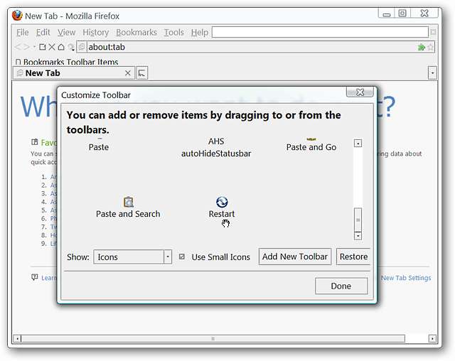 Si vous préférez garder votre «Barre d'outils du menu» cachée, vous pouvez utiliser le bouton de la barre d'outils pour QuickRestart à la place. «Faites un clic droit» sur l'une de vos barres d'outils et sélectionnez «Personnaliser…» pour ouvrir la fenêtre «Personnaliser la barre d'outils». Le bouton de la barre d'outils sera très probablement situé en bas ou près du bas… placez-le dans un emplacement qui répond le mieux à vos besoins.