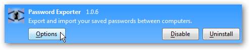 Ouvrez l'écran Modules complémentaires et recherchez l'Exportateur de mots de passe dans la liste, où vous pouvez cliquer sur le bouton Options pour afficher la boîte de dialogue Importer / Exporter les mots de passe.