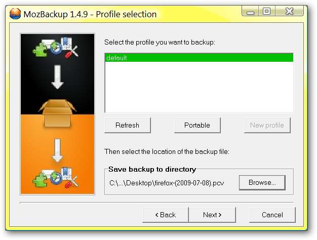 Dans le troisième écran, il vous sera demandé de choisir le profil que vous souhaitez sauvegarder et où enregistrer le fichier de sauvegarde. Puisque nous sauvegardons une installation par défaut, nous avons choisi «default». Notez qu'il existe un bouton de sélection pour les portables ( charmant! ).