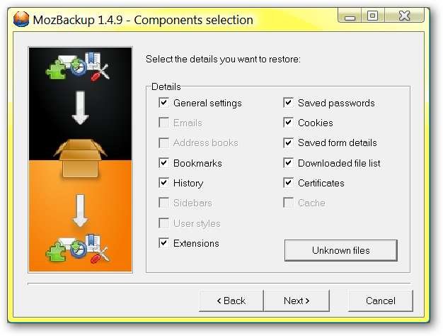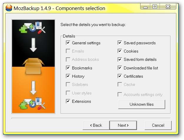 Dans la quatrième fenêtre, vous avez la possibilité de choisir les parties du profil Mozilla que vous souhaitez sauvegarder. Cliquez simplement pour sélectionner ou désélectionner une option particulière. Remarquez le bouton qui dit «Fichiers inconnus» en bas. Cela vaut la peine d'y jeter un coup d'œil si vous souhaitez affiner encore plus votre sauvegarde.