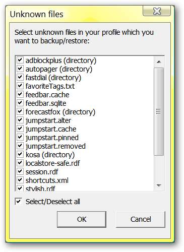Si vous cliquez sur le bouton «Fichiers inconnus», vous verrez la fenêtre suivante vous offrant plus de choix sur ce que vous aimeriez avoir sauvegardé ( magnifique! ). Cliquez pour sélectionner ou désélectionner des options. Cliquez sur «OK» lorsque vous avez terminé.