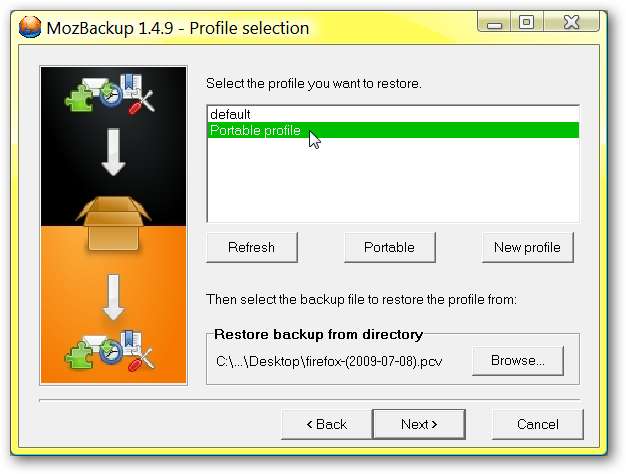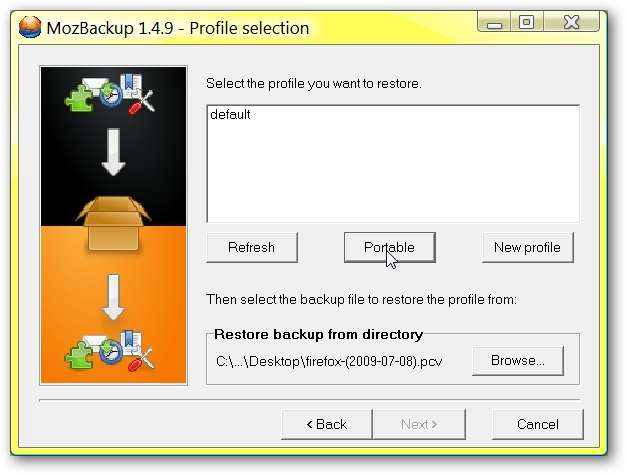 Dans la troisième fenêtre, vous devrez rechercher le fichier de sauvegarde que vous avez créé précédemment (il est recommandé de le faire en premier), puis choisir le profil dans lequel vous souhaitez restaurer. Comme nous restaurons vers une version portable dans notre exemple, nous avons cliqué sur le bouton «Portable».