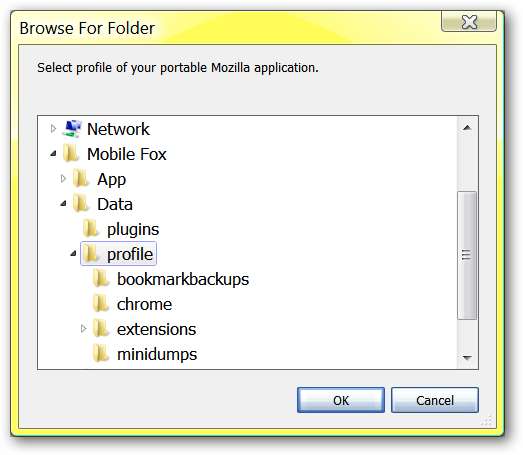 Cliquez sur le bouton «Portable» pour ouvrir une fenêtre de navigation permettant de localiser le dossier de profil d’un navigateur portable. Dans notre exemple, le nom du dossier de départ du portable était «Mobile Fox» (Mobile Fox -> Données -> profil). Cliquez sur OK".