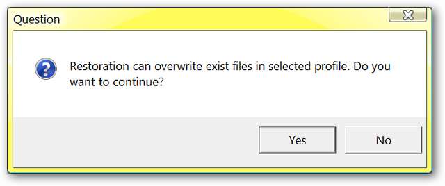 Après avoir cliqué sur «Suivant» dans la quatrième fenêtre, vous verrez ce message vous demandant si vous êtes certain de vouloir écraser le dossier de profil que vous avez sélectionné précédemment. Une fois que vous avez cliqué sur «Oui», le processus de restauration commencera immédiatement.