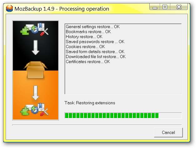Ici, vous pouvez voir MozBackup restaurer le profil dans notre exemple. Le processus de restauration semble aller beaucoup plus vite que le processus de sauvegarde…