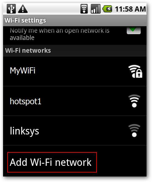 Pour vous connecter à un réseau Wi-Fi avec un SSID masqué, sélectionnez Ajouter un réseau Wi-Fi dans les paramètres.