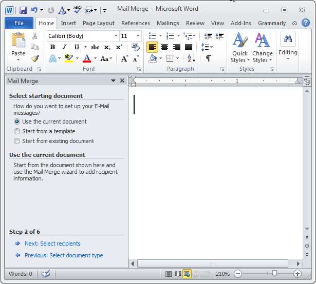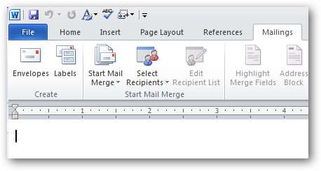 Commencez avec un document vierge et ouvrez le ruban «Mailings» pour commencer notre publipostage.