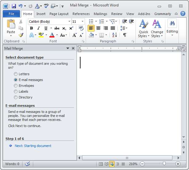 L'assistant nous demandera de choisir le type de document pour notre publipostage. Les messages électroniques sont le type de document approprié pour l'exercice de publipostage d'aujourd'hui.