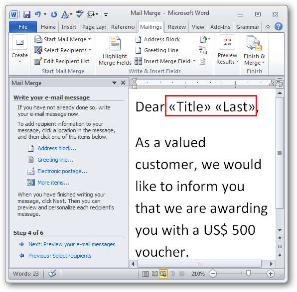 Prévisualisez votre message électronique pour voir comment Word traite les champs de fusion en cliquant sur le lien «Suivant: Aperçu de vos messages électroniques».