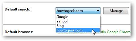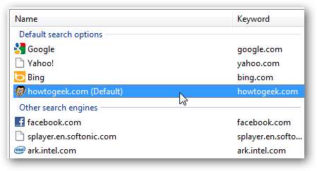 Ici, nous avons fait de notre recherche HowtoGeek.com une option par défaut. Maintenant, notez qu'il est répertorié sous le Options de recherche par défaut .